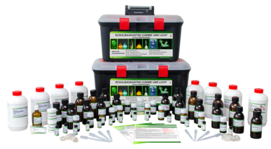 Im Kit-Standard findet sich eine Reihe von attraktiven Experimenten, die mit Chemie und Licht zu tun haben. Zu jedem Experiment gibt es die entsprechenden Schülerinstruktionskarten, methodische Karten für Lehrpersonal und ein Lehrhandbuch mit detailierten Erklärungen.